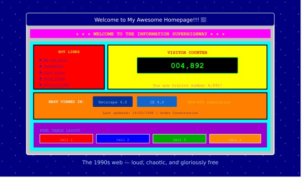 This era also brought us the animated GIF, gaudy background colours, visitor counters, and marquee scrolling text. If you were online in 1997, you'll know exactly what we mean. Websites were loud, chaotic, and often genuinely difficult to read — but they were also exciting. The web felt like the Wild West, and everyone was staking their claim.